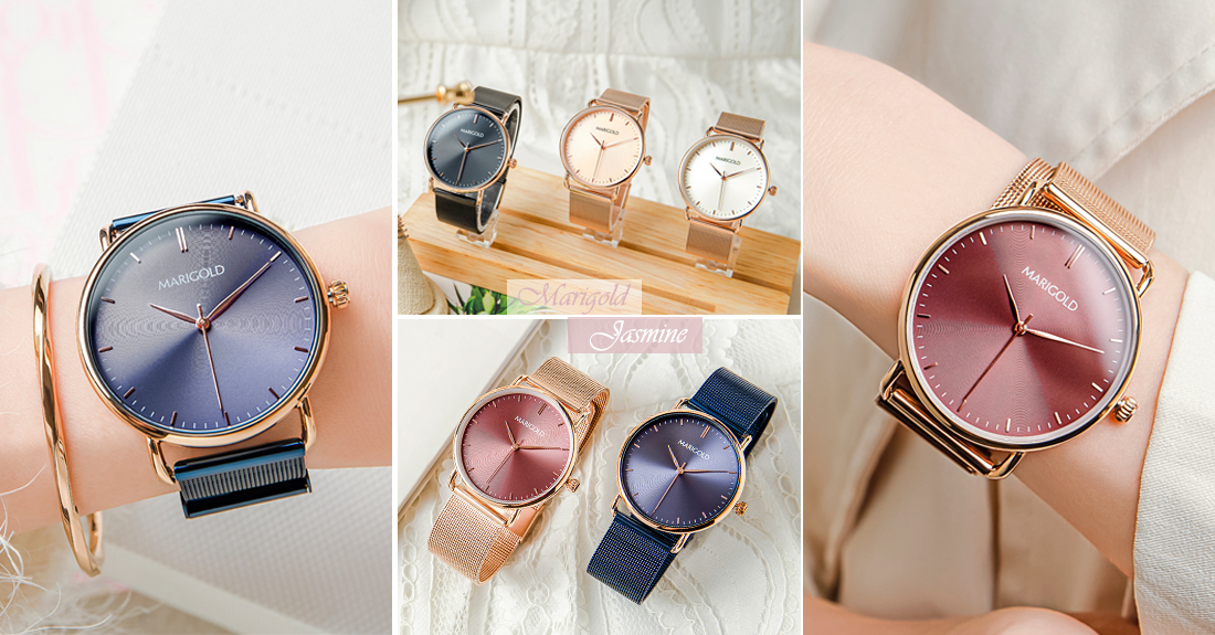 比起矚目,「簡約、平凡卻讓人難忘」對Jasmine錶款是更好的註解,Jasmine錶款在MARIGOLD系列中屬於簡約、素雅的款式,時間刻度以線釘作為設計,微微的炫光錶面總是於瞬間抓住你的目光。