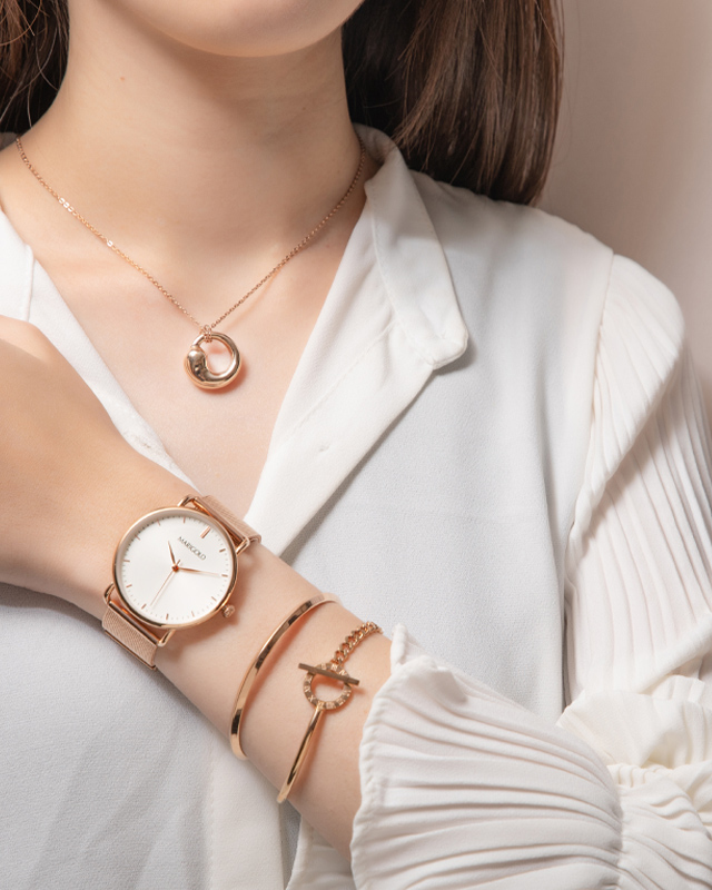 不管擁有多少支手錶,都絕對要有一支能因應任何場合、簡約百搭的手錶!經典不敗的白金Jasmine錶款,純以線釘作為時間刻度大器、典雅,這樣簡單又充滿韻味的設計無論過了五年、十年依然能在群眾裡成為焦點,搭上玫瑰金手鐲更能顯出女性大方、不造作的特質!