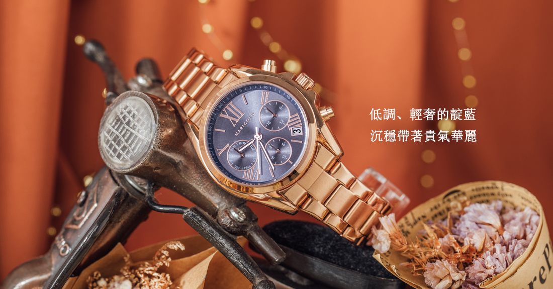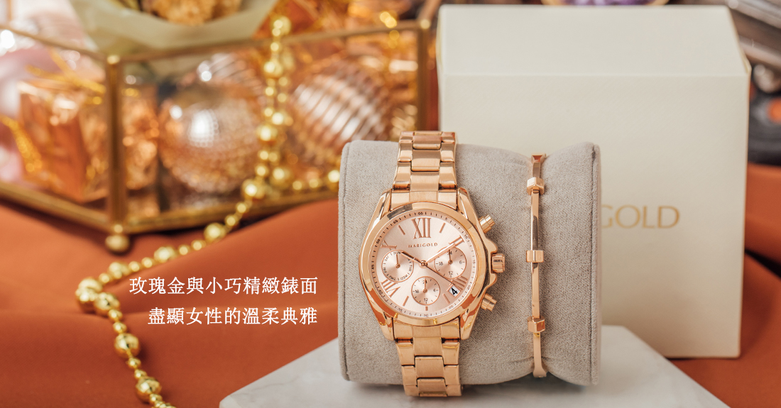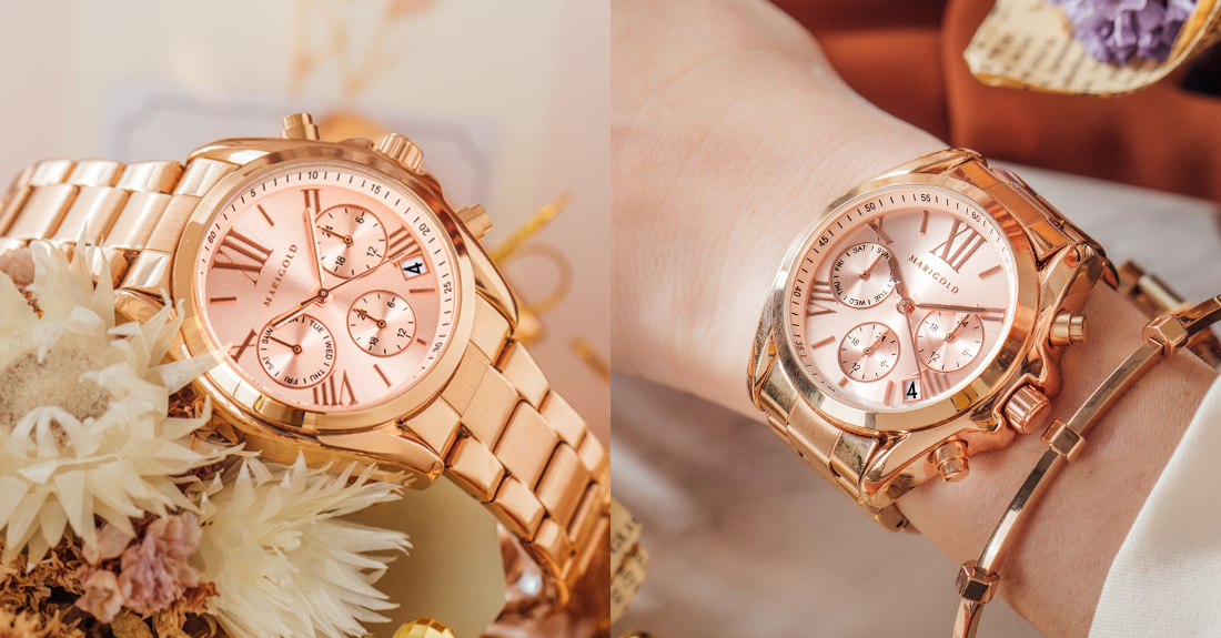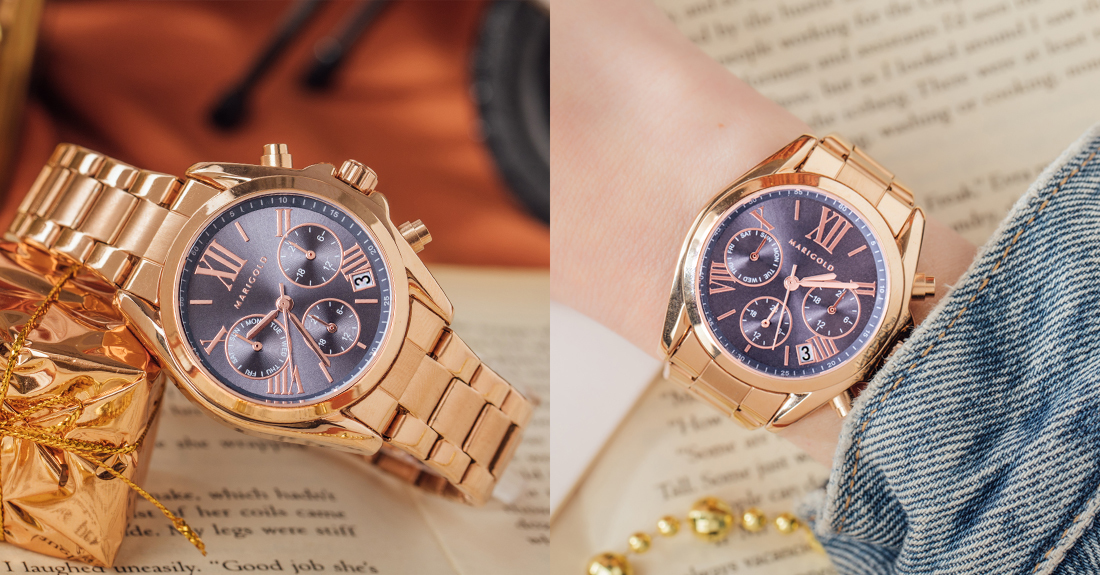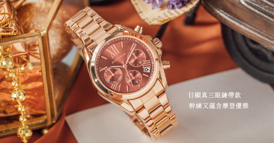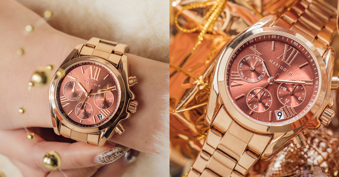 MARIGOLD聽見廣大女生們的心願,全新推出Paris daisy日顯真三眼鍊帶錶,以小直徑的錶面搭上玫瑰金鍊帶、完美結合女性的優雅及幹練,就連小手圍的女生戴起來也完全不突兀,這樣可甜可帥的時尚錶款難怪一上市就詢問度破表!