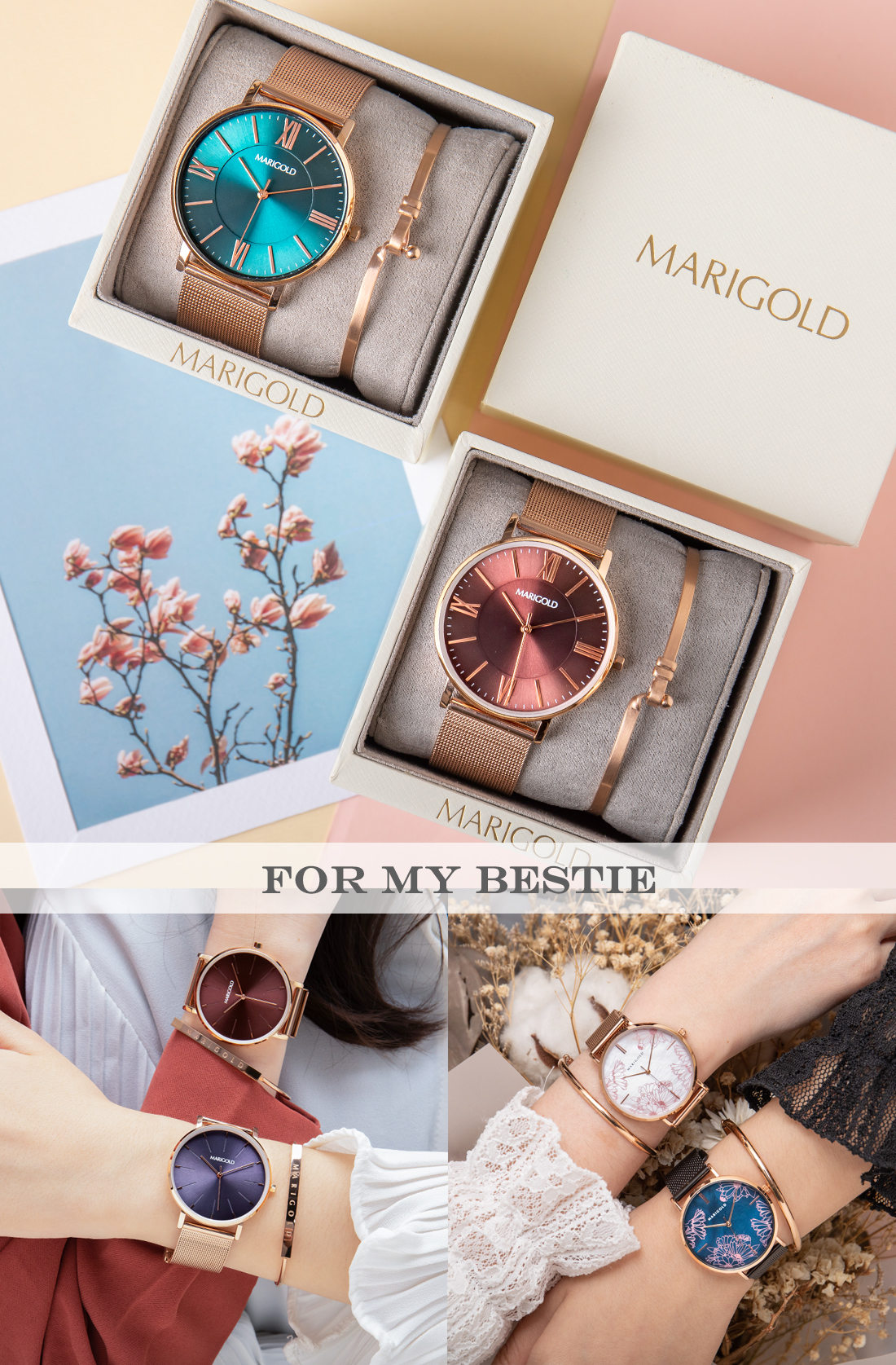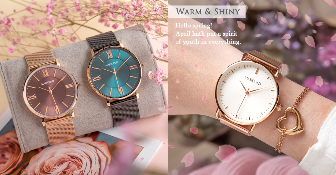 溫暖的季節到來,迎向以浪漫、希望孕育而成的春暖花開之時,無論之前遇到什麼困難、遭遇什麼傷心時刻,那些都將成為過去、現在的你即將與幸福相遇!感謝陪你走最多路的自己,戴上充滿祝福的MARIGOLD手錶手環,這次就大膽邁出步伐走出自己的時尚大道~