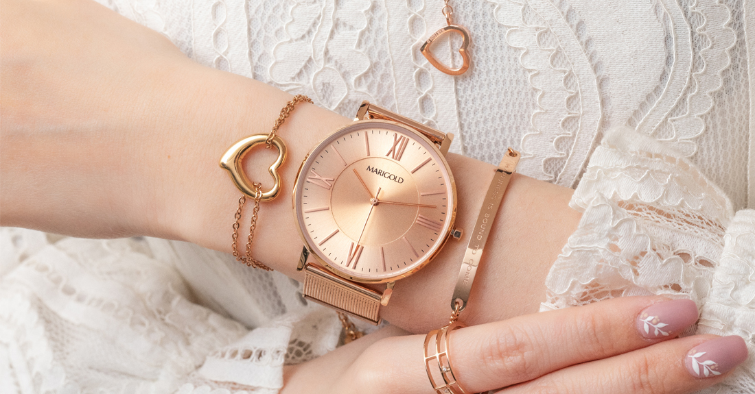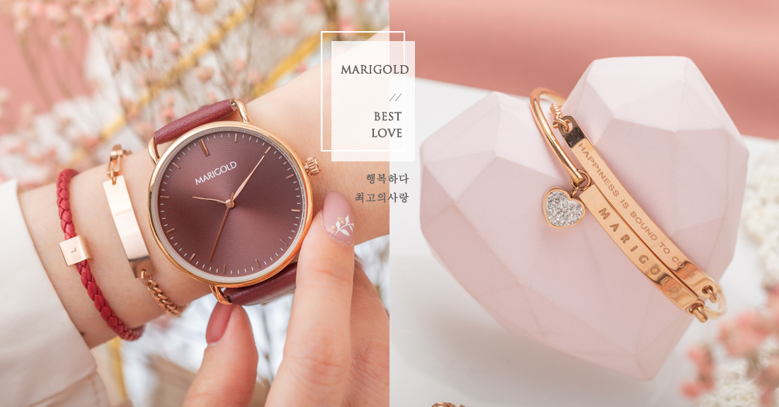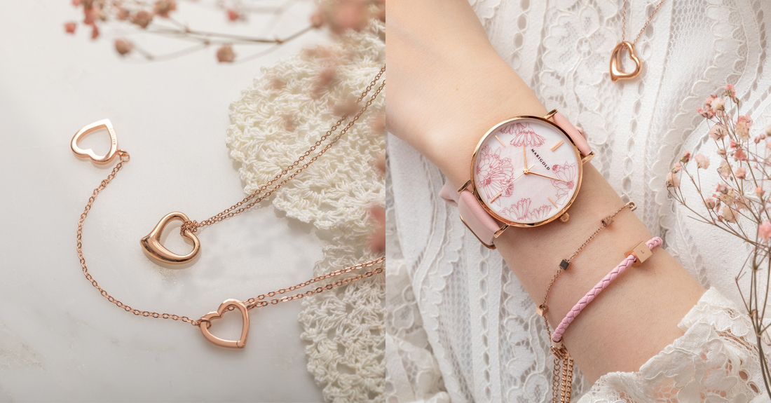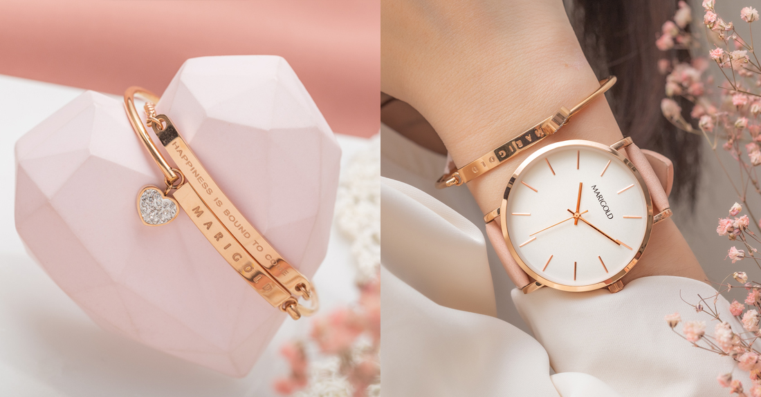 另外戀愛滿分飾品還有這兩款~鑲鑽愛心墜飾手環及有著金盞花花語「必將到來的幸福」刻印的玫瑰金手環,極簡優雅的設計凸顯女生的溫柔與氣質,Sunny推薦可以搭配White rose的粉色真皮錶款,戴上後立刻讓人想熱戀的柔嫩的氛圍~