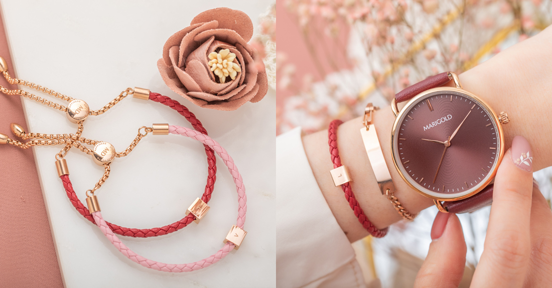除了顏色較濃的酒紅色,喜歡粉嫩嫩的你不妨考慮這款Marigold獨家手繪花錶配上粉色L.O.V.E皮繩手環,將戀愛的粉嫩色彩戴在手上、以最佳狀態遇見自己的Mr.Right!加點愛心墜飾的玫瑰金項鍊更有魅力喔~