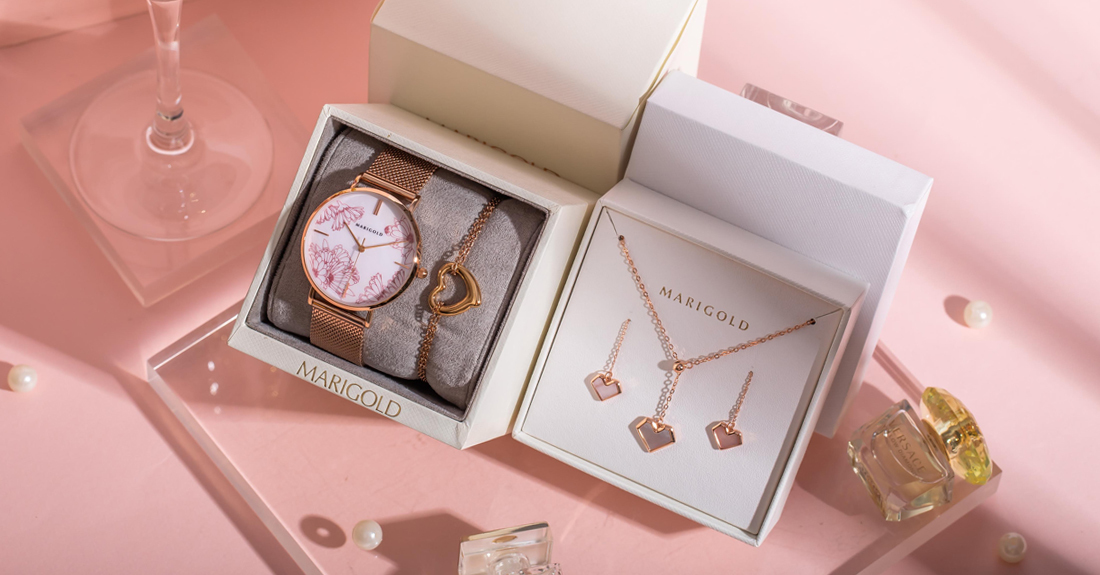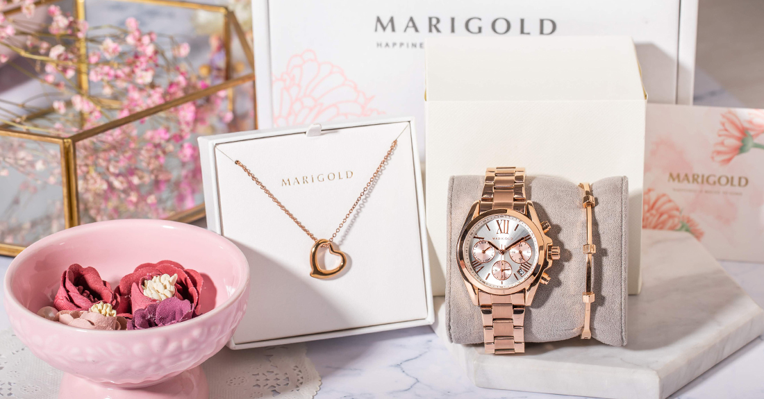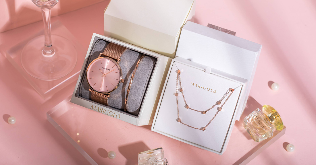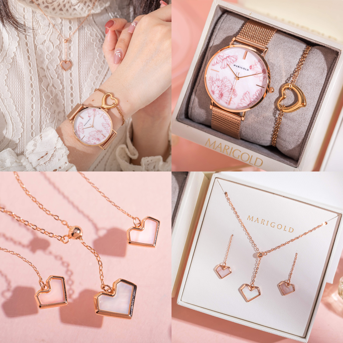 MARIGOLD不只出了新色錶款,還推出超值四件組禮盒!全新Marigold獨家手繪花錶與母貝愛心飾品組完全是女孩們大愛的組合~將金盞花花語「必將到來的幸福」結合錶款飾品,戴上後就像充滿祝福一樣!有了這樣的寓意讓配件變得更加漂亮~