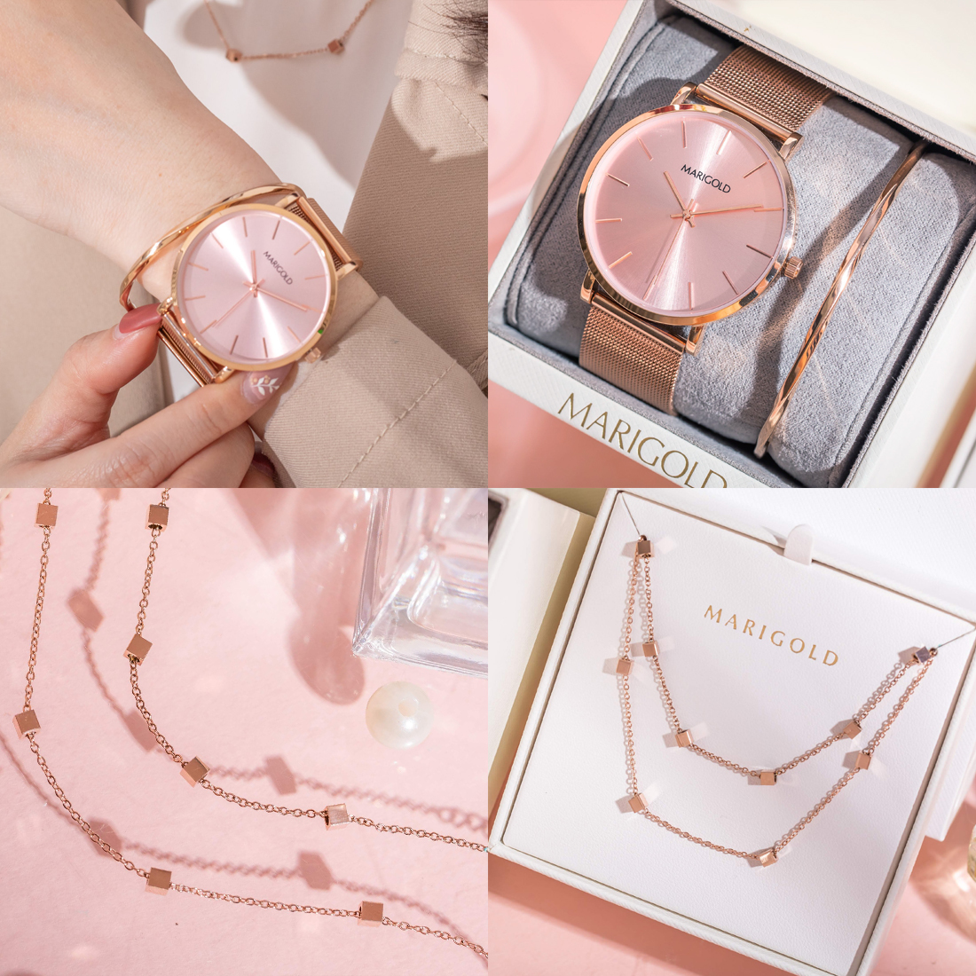 同樣四件禮盒組還有Rose系列,用極簡打造永恆經典就是對Rose系列最好的註解,僅以炫光及大刻度設計做造型重點,搭上細膩的小方塊手鍊及項鍊完美戴出女生的優雅和精緻~喜歡簡單、時尚風格的你這組絕對必收!