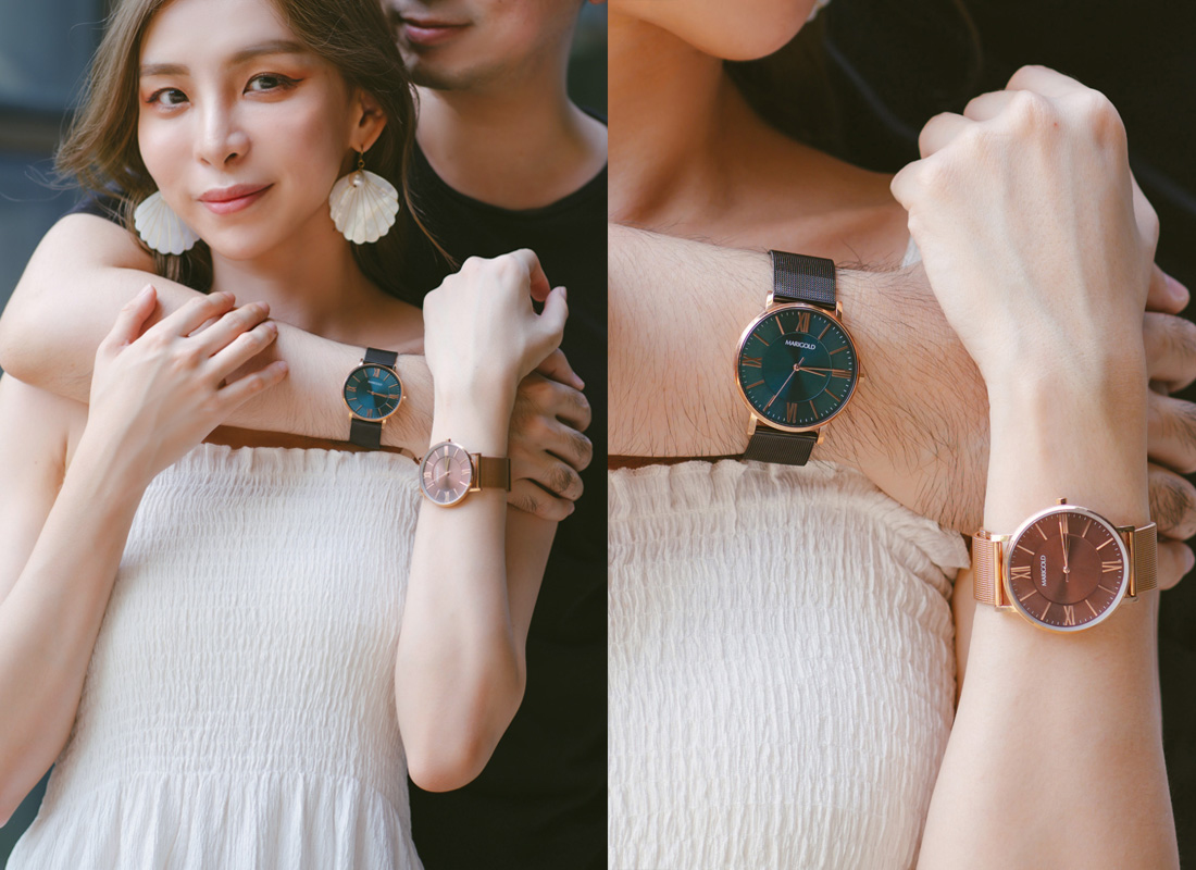 時尚編輯珂荷莉大力推薦這款人氣王Brilliant羅馬字立體雙環紅綠對錶!羅馬數字和炫光設計的錶盤讓人不注意都難,輕熟迷人的酒紅女生款搭上超特別的藍綠色男生款真的超好看!情人節戴上MARIGOLD對錶不只浪漫,還非常時尚呢~
