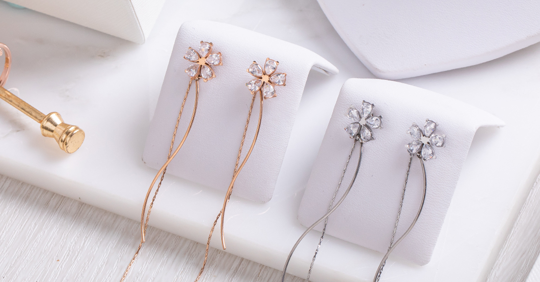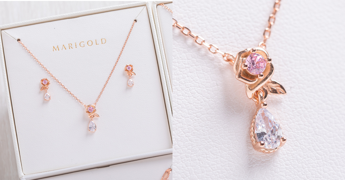 其中925純銀的Rose系列-玫瑰耳環搭上玫瑰項鍊,立體、精緻的設計就像栩栩如生的花朵在胸前、耳上綻放,耀眼的鑲鑽設計漂亮到不行!