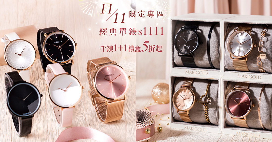 瘋狂購物的雙11慶典來啦~MARIGOLD全年最優惠的強檔一次推出!連小編都驚呼連連一起搶著買~不只推出經典單錶超值均一價$1111、還給你雙倍回饋!這個雙11不用思考怎麼買,只要知道買多賺多就對啦~