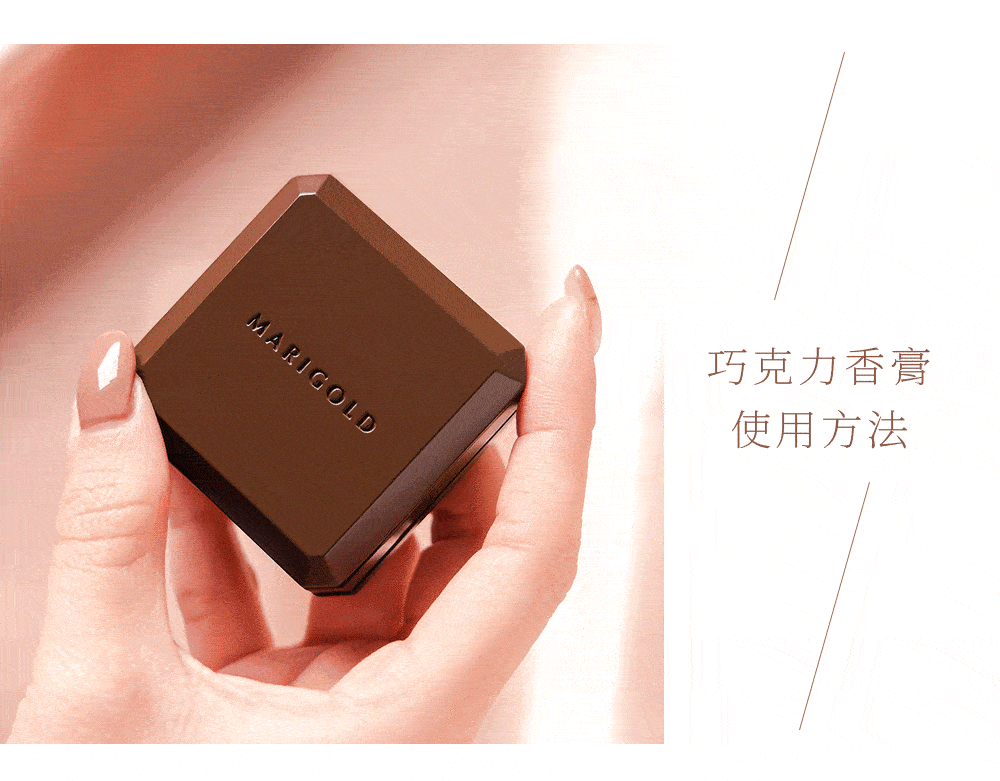 香膏最大的特色就是當你抹上的第1、2秒好似沒什麼特別,但過了1~3分鐘香膏已與體溫融合後所散發的香味,會像是由肌膚裡自然呈現、而非外來的添加品,這也是和香水最大的不同,比起香水一噴就有的艷麗,香膏隱隱約約的香氣更能深植人心!喜歡收藏香氛單品的你,現在就快點到MARIGOLD入手這專屬你的嗅覺記憶、高人氣的巧克力香膏吧~