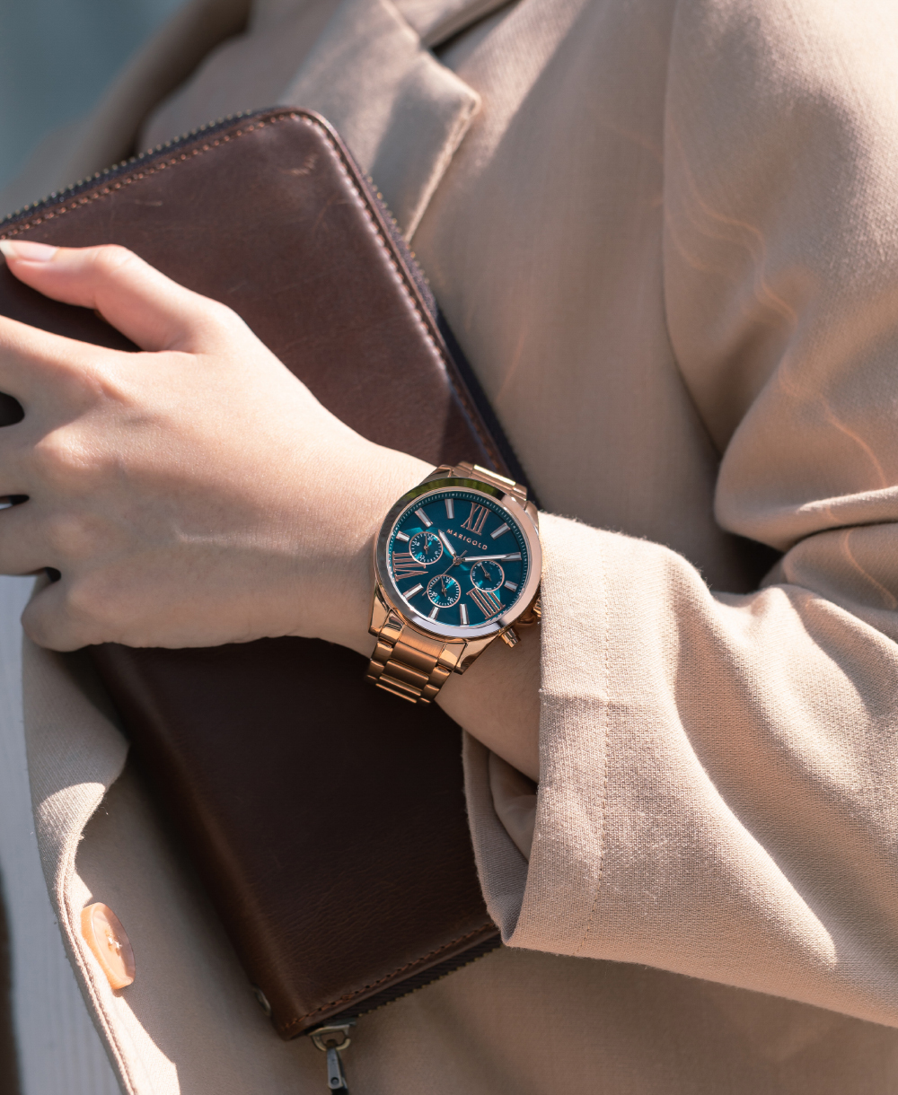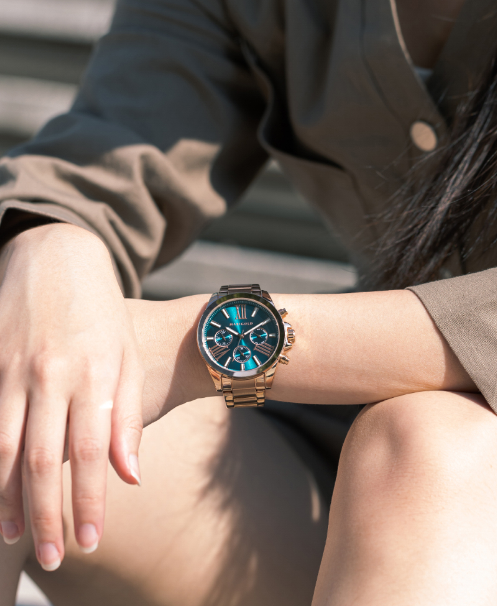 MARIGOLD推出的Sparkling與Glorious真三眼功能分別為「日期、星期與24小時制」讓你更好掌握完整的時間資訊,綠金的絕美配色彰顯配戴者的優雅與貴氣!而Glorious系列指針更添加了夜光設計,即使在黑暗中也不怕失去時間感!