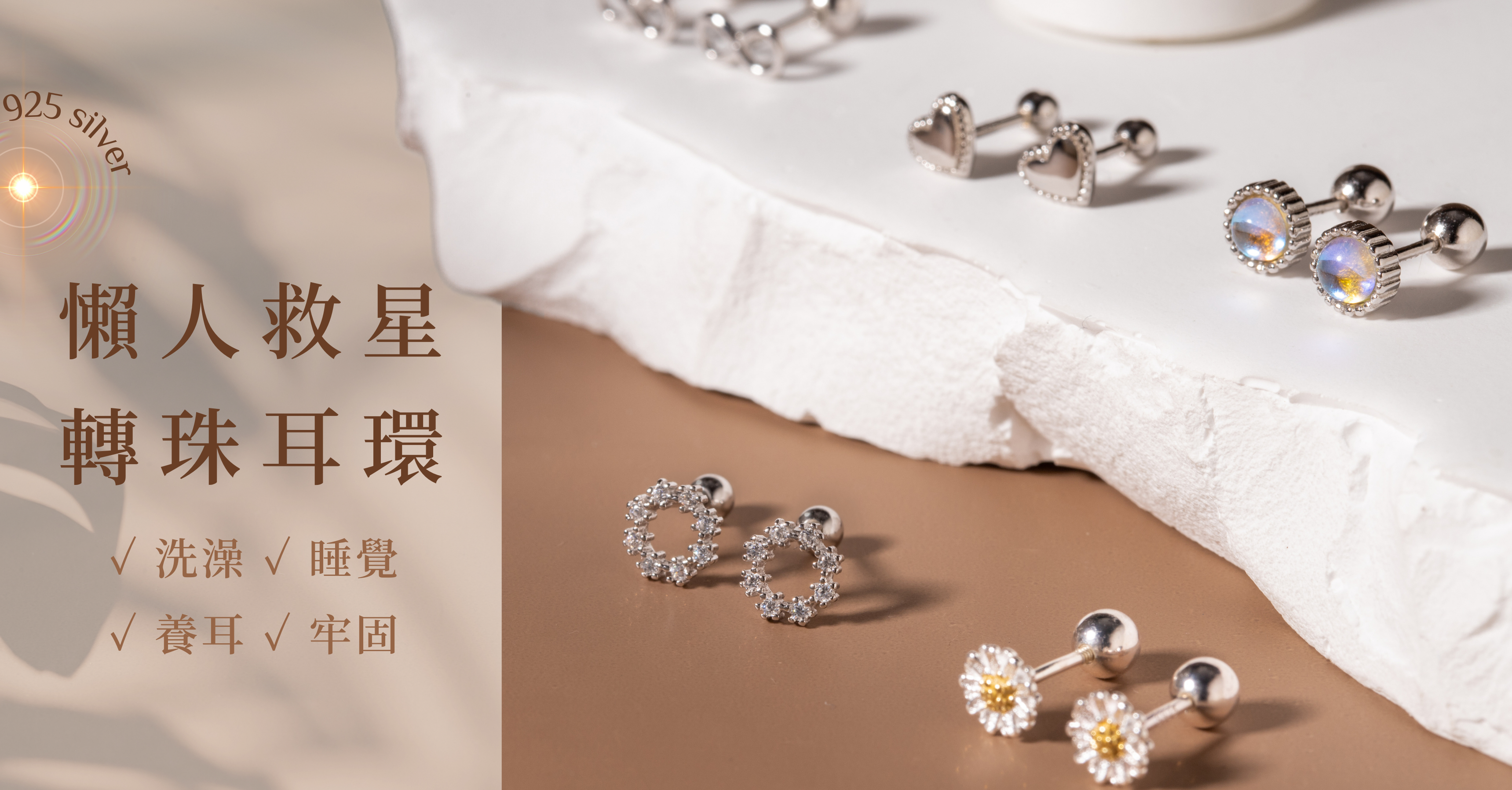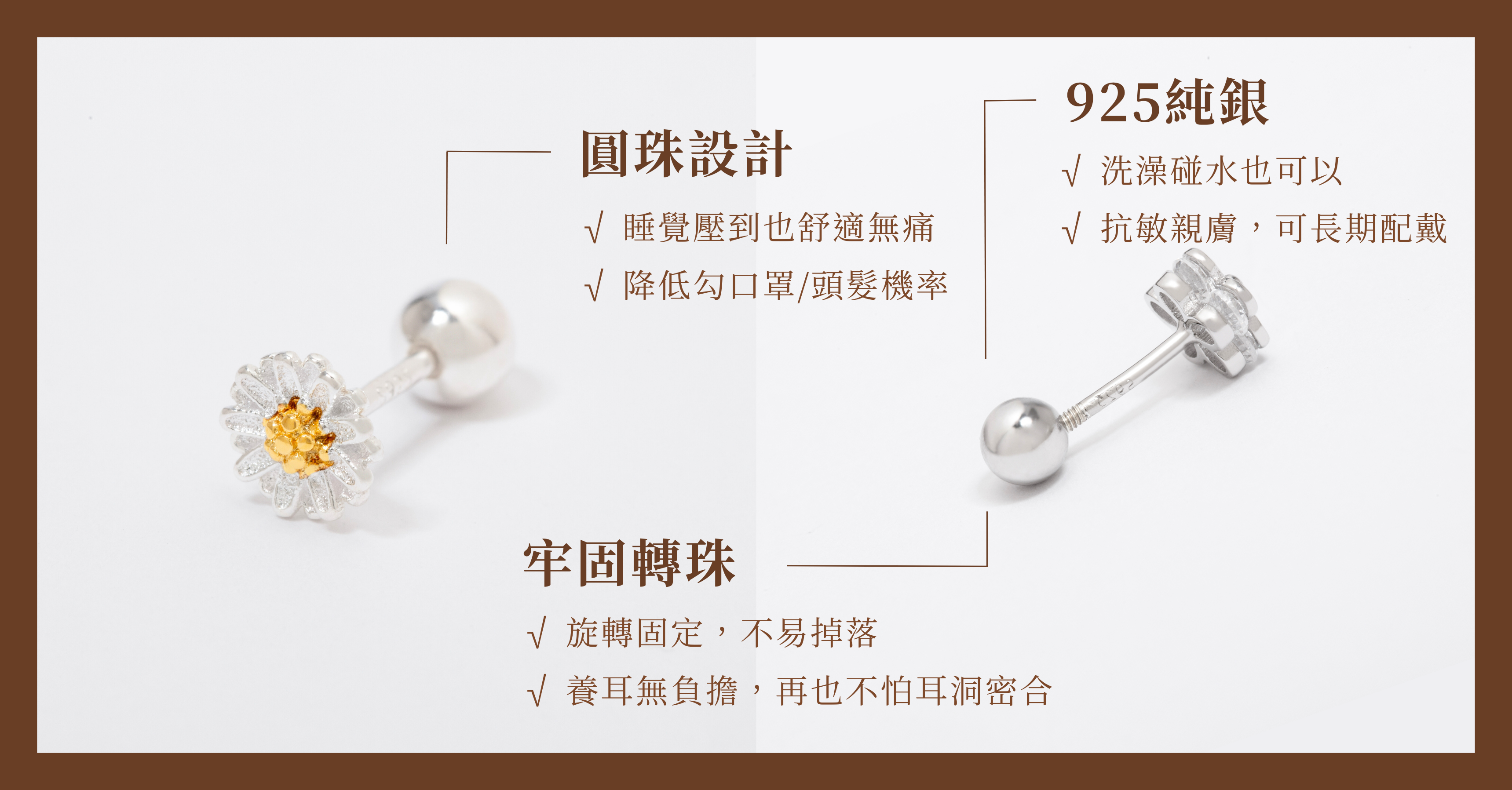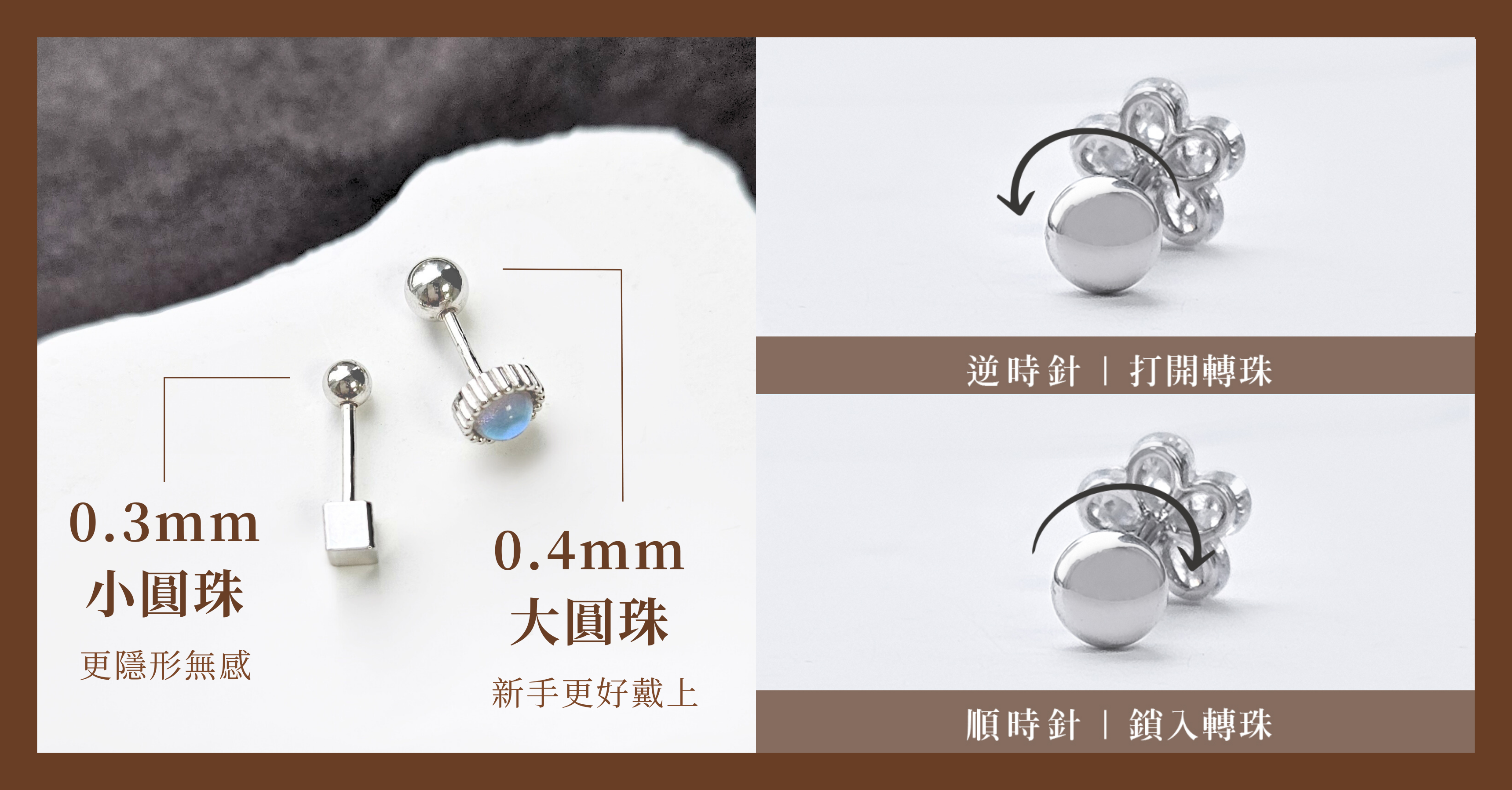 轉珠耳環也稱作「鎖珠耳環」、「擰珠耳環」,大多使用高抗敏的材質製作,後面耳扣是以圓珠旋轉鎖緊,而我們的轉珠耳環都是使用925純銀,抗敏親膚好保養。