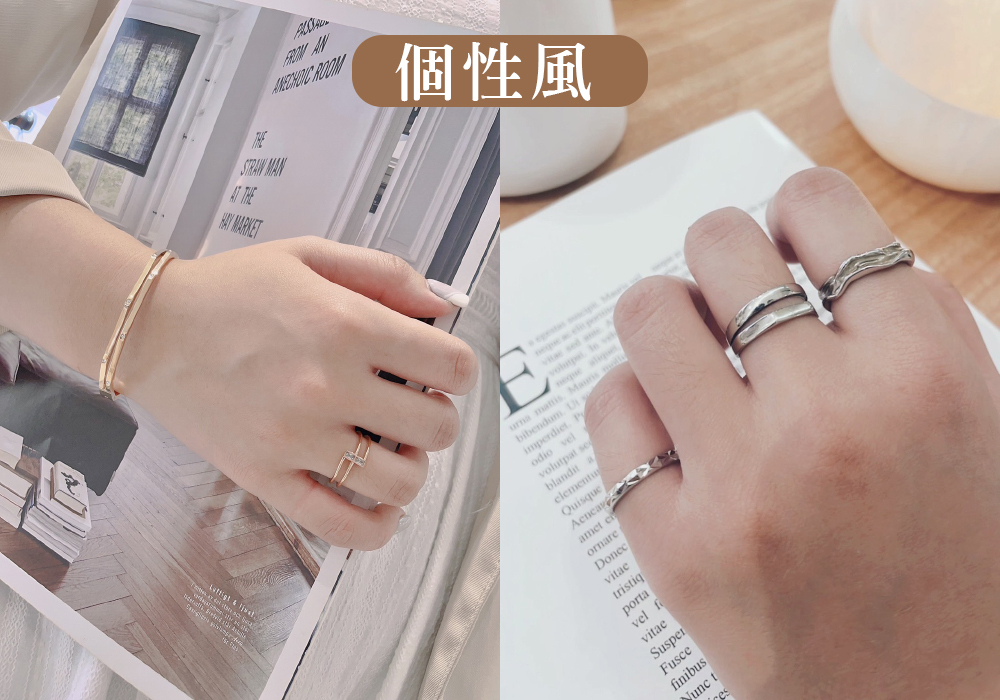 個性的你,可以選擇較寬版、幾何感或是多邊形設計的飾品,這樣的飾品除了單獨配戴就吸睛外,搭配疊戴更有獨樹一格的魅力!無論是玫瑰金還是銀色款,戴上後都能營造小歐美風的感覺喔~