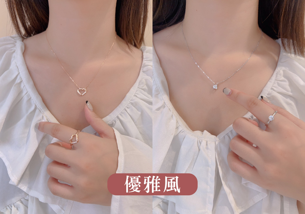 若是走優雅氣質路線,推薦你可以選擇愛心或鑲鑽款的成套飾品~其中關鍵就是盡量選擇線條較細、墜飾較精緻小巧的樣式!看起來只是一些些的點綴,但那才正是凸顯優雅氛圍的小心機啊~