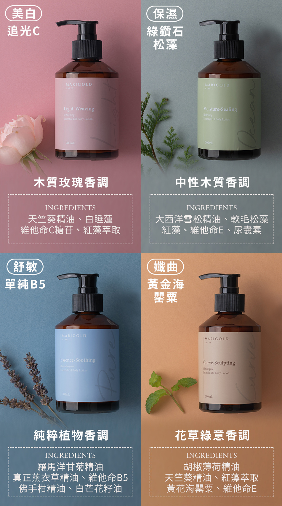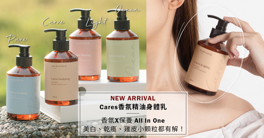 日常除了臉部保養外,也別忘了要好好呵護身體肌膚~很多人臉部補水補足了,卻忽略因處在冷氣房或在外受到日曬的身體肌膚也在求救、喊渴,長期下來導致老廢角質堆積、肌膚摸起來都變得粗粗的...現在就來介紹MARIGOLD全新Cares香氛精油身體乳!保養後立即還你稚嫩透亮肌~