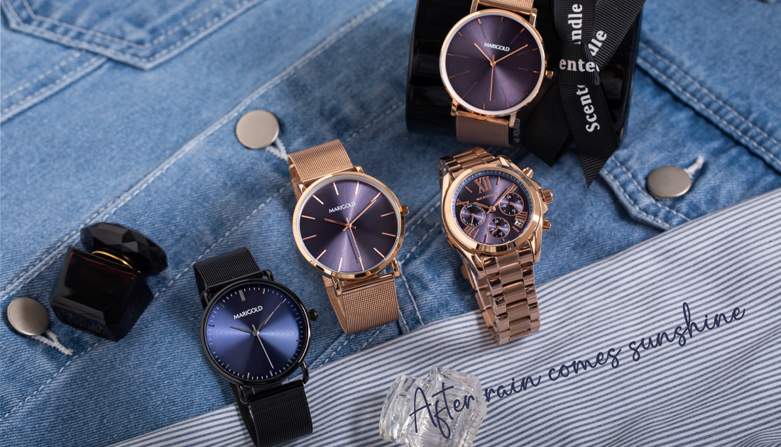 「After rain comes sunshine」,灰暗後總會遇見雨過天青的美麗,MARIGOLD獨家特調出的藍將這份希望結合錶款、願每個被壟罩在影子深處的心能被點亮,戴上「雨過天青」的藍色錶款用無畏的步伐遇見風和的明天。