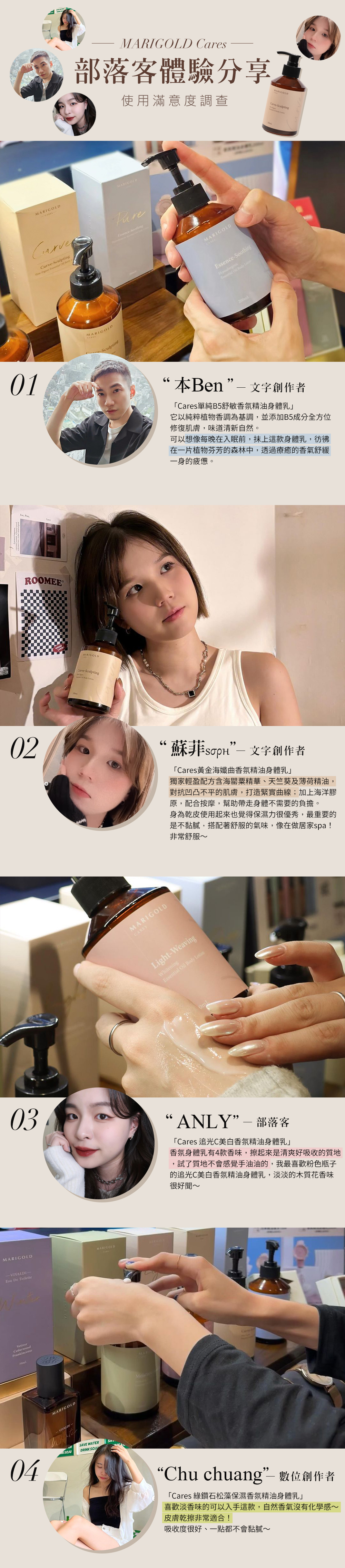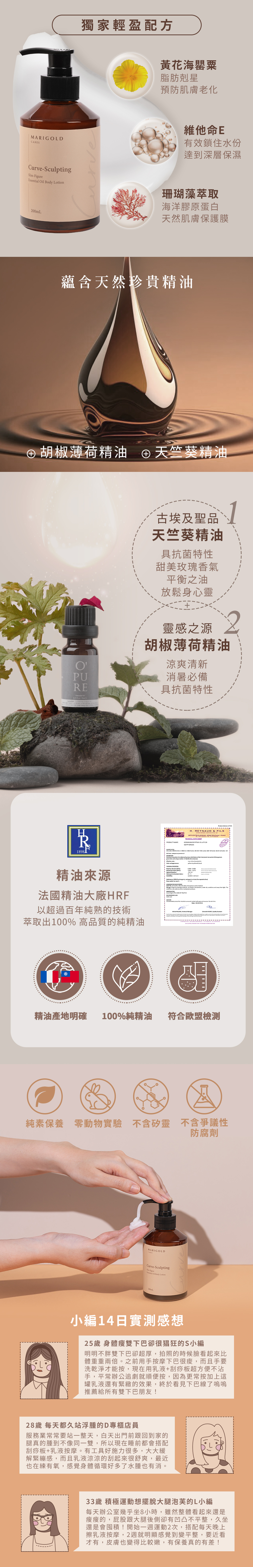 獨家輕盈配方含海罌粟精華、天竺葵及薄荷精油,對抗凹凸不平的肌膚,打造緊實曲線;加上海洋膠原,只給保濕不給黏膩,配合按摩,幫助帶走身體不需要的負擔。