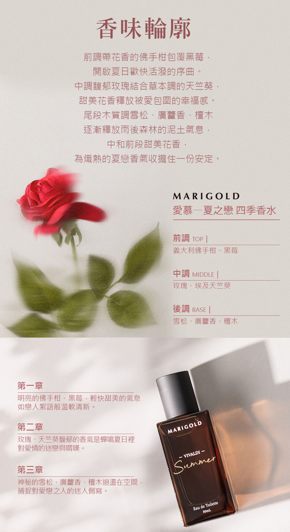 MARIGOLD香水內含天然精油成分比例較高,若有顏色變深或沉澱,屬自然現象,請搖晃均勻安心使用。